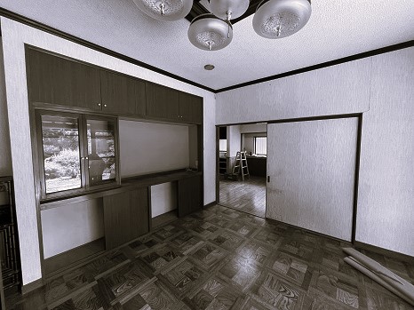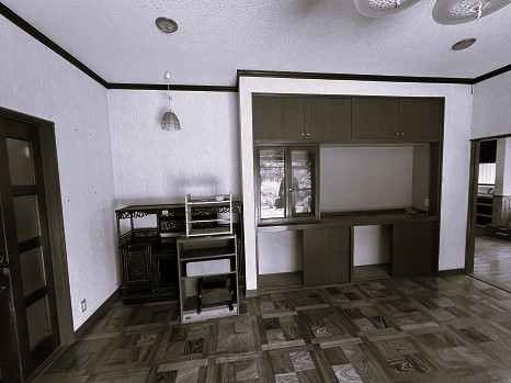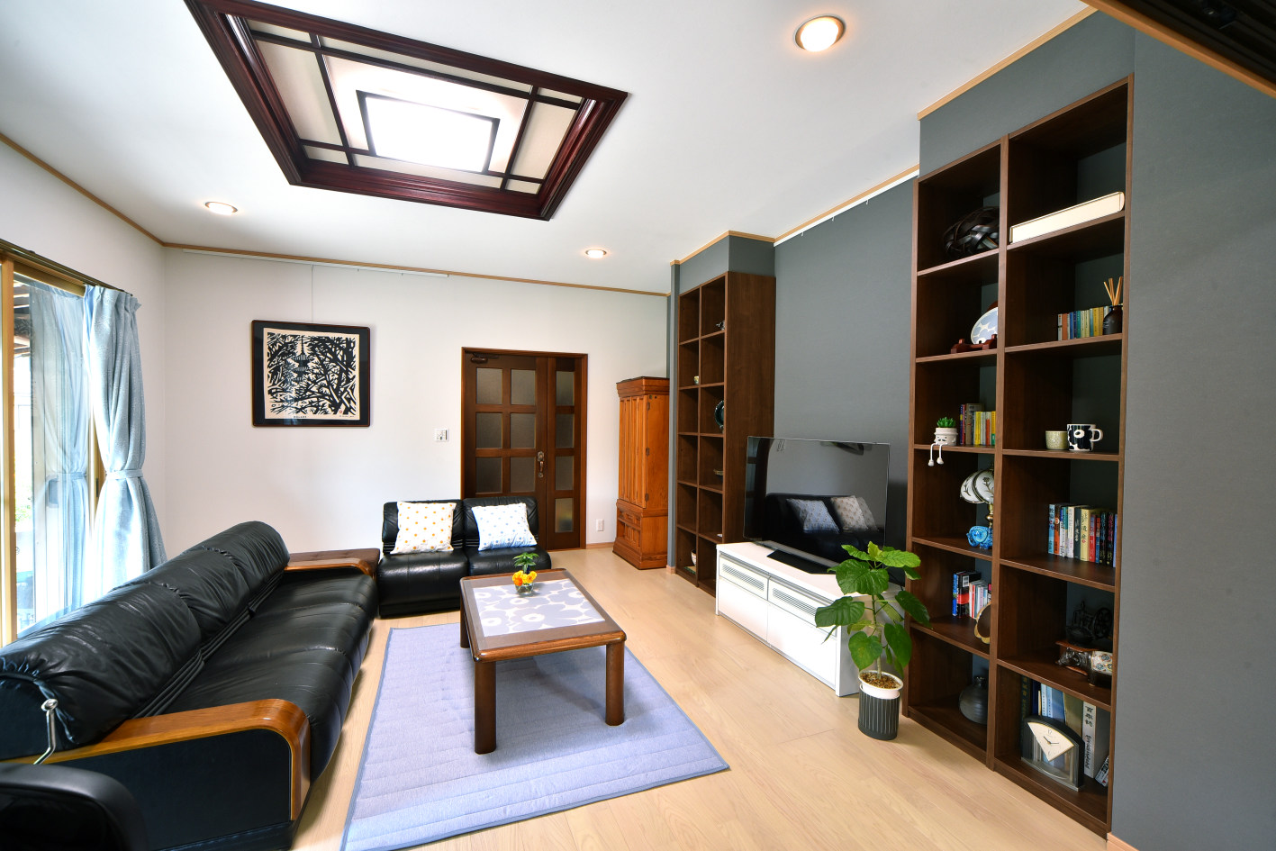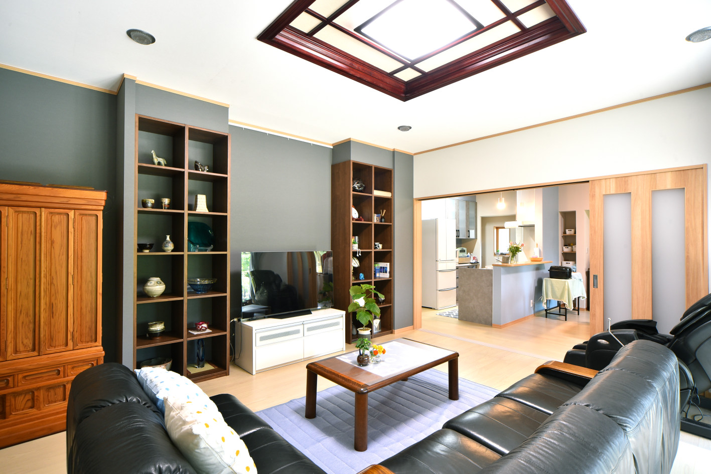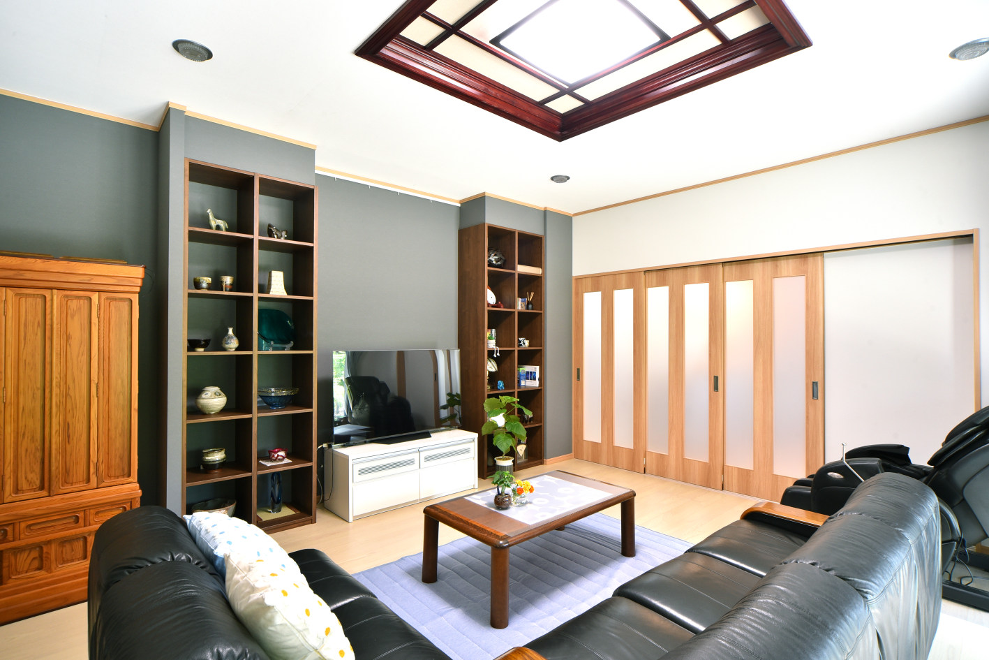 ご提案した内観パースでのアクセントクロスを気に入っていただき、一面にダークグレーのクロスを貼りました。折り上げ天井の飾りはそのまま残し、重厚感のあるリビングに。