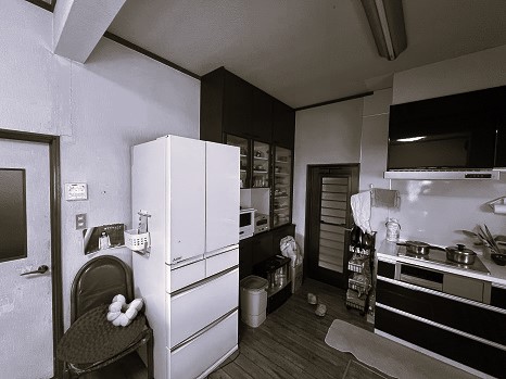キッチンの奥には可動式の棚が向き合って設置してあります。オープンの収納なので調理器具や食材が手軽に取出しできます。キッチン側からは見えない場所にあり、使い勝手が良いと好評です。