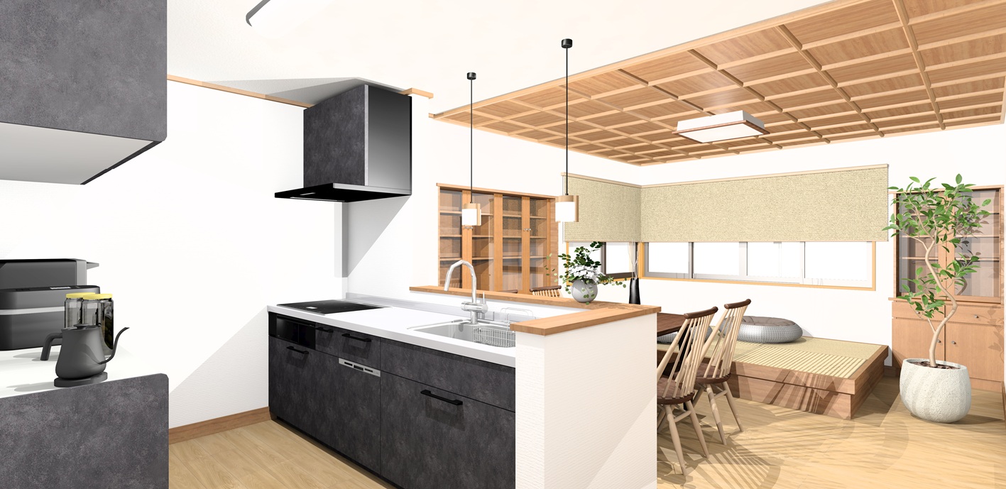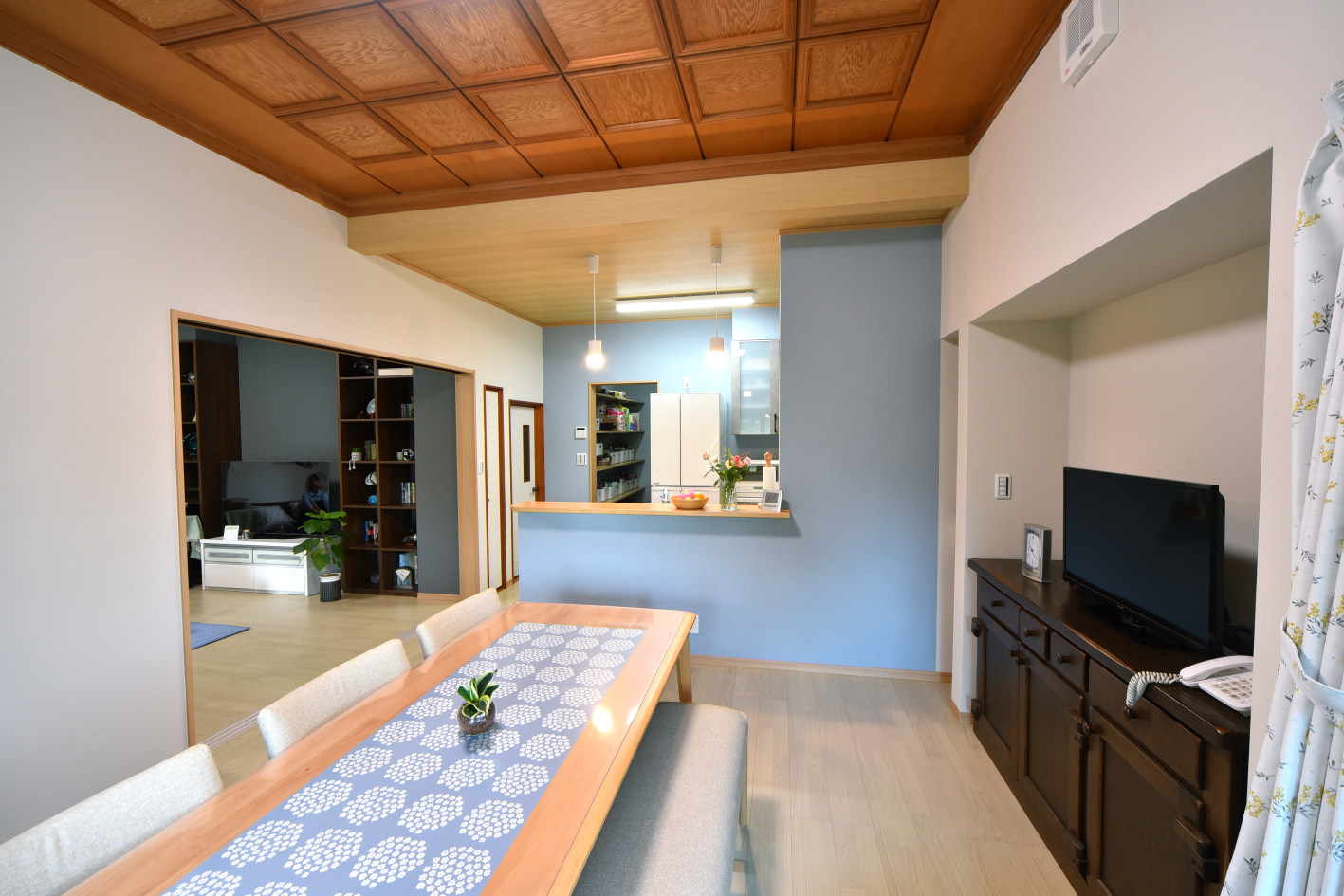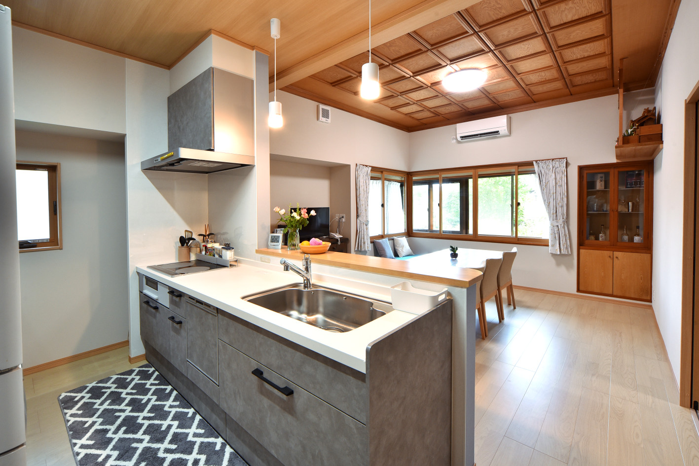 キッチン・ダイニング・リビングがL型で配置されており、空間を一体的に使えるよう対面キッチンとしました。既存で状態の良い(作りの良い)格天井・折上げ天井はあえて残し、デザイン的にも良いアクセントとなりました。