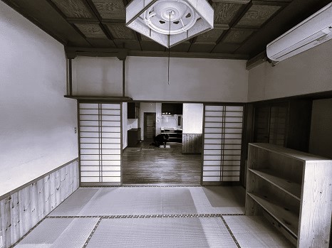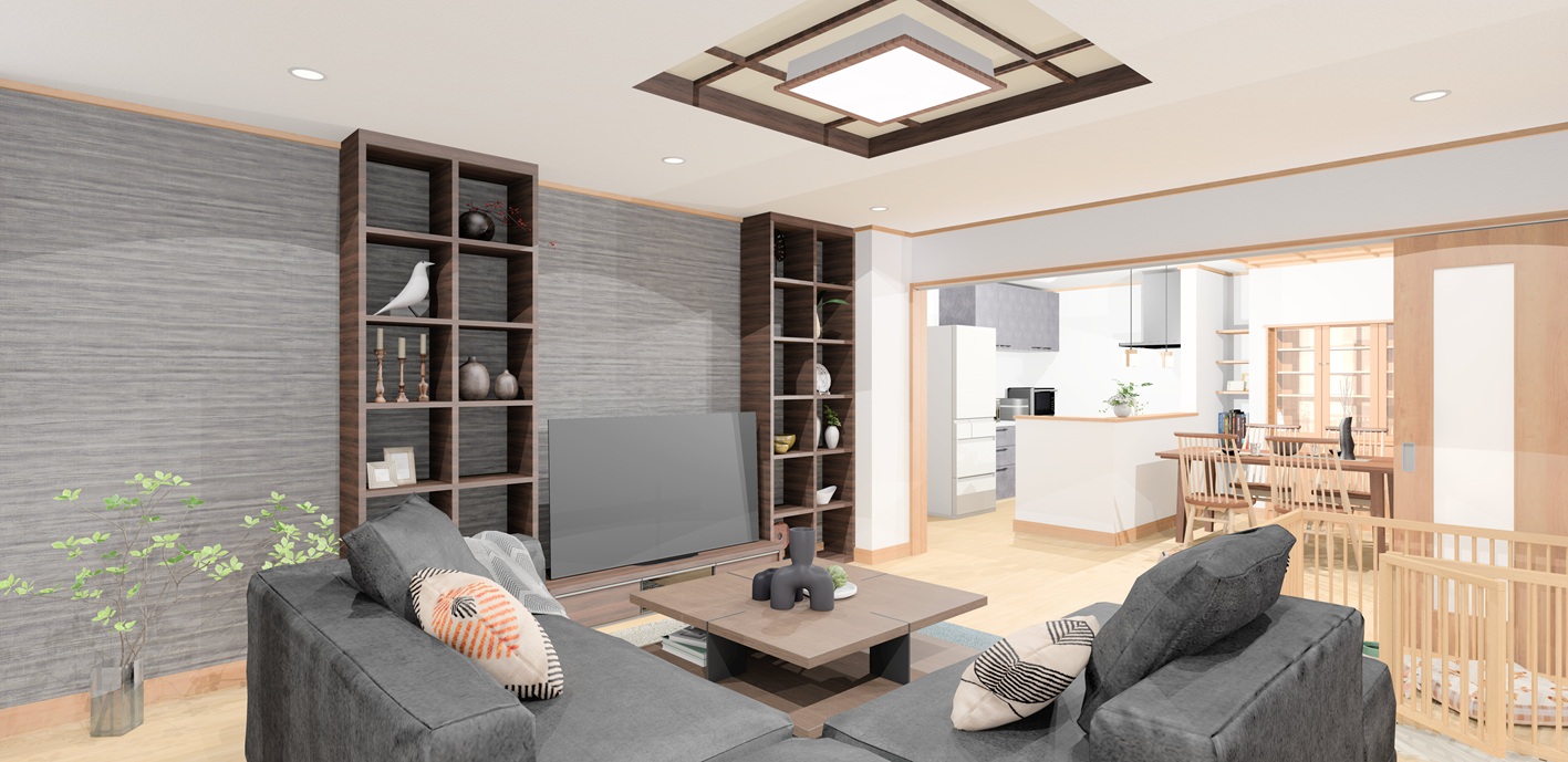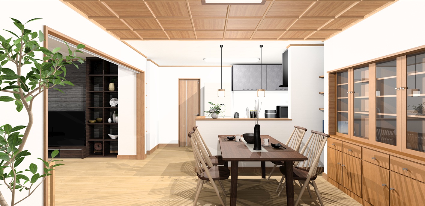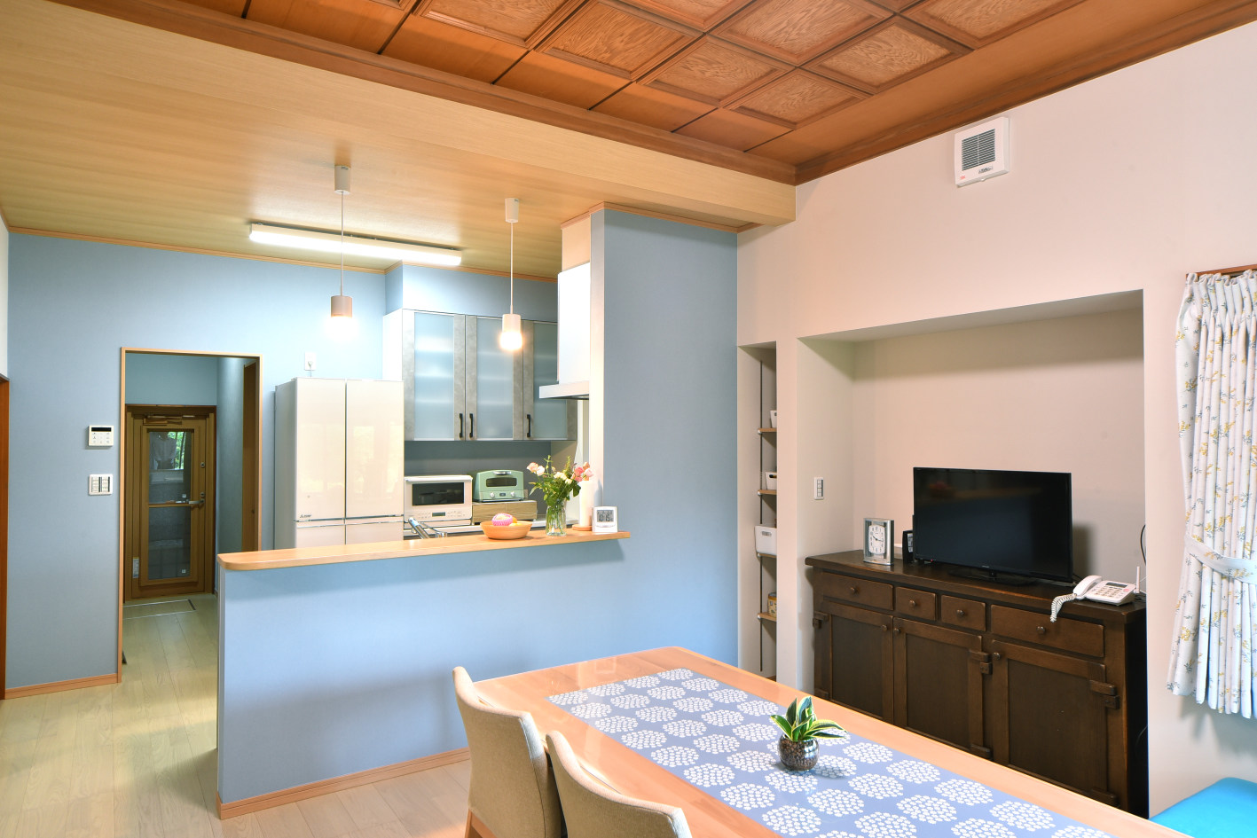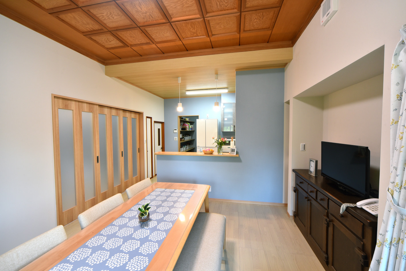 キッチン・ダイニング・リビングがL型で配置されており、空間を一体的に使えるよう対面キッチンとしました。既存で状態の良い(作りの良い)格天井・折上げ天井はあえて残し、デザイン的にも良いアクセントとなりました。