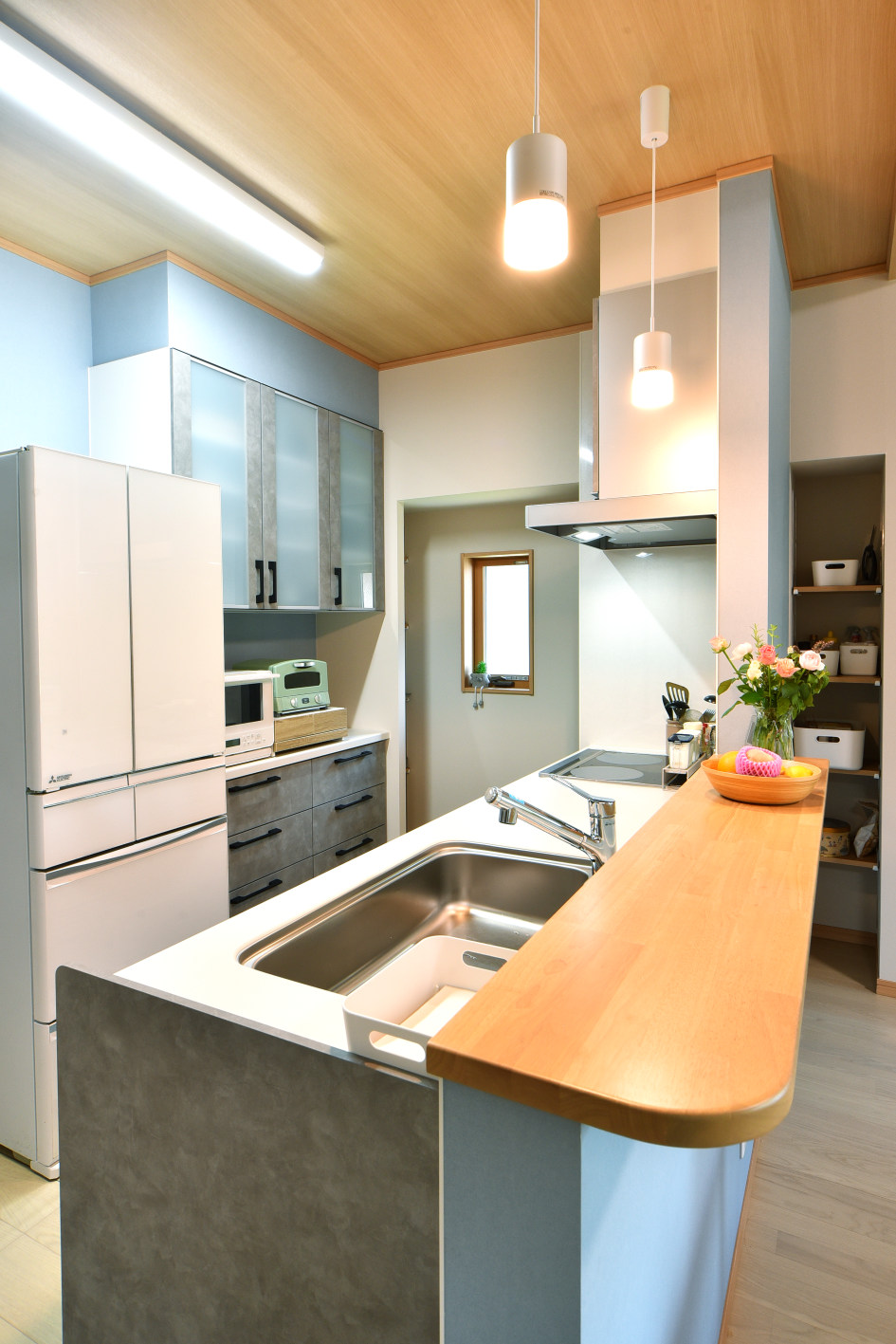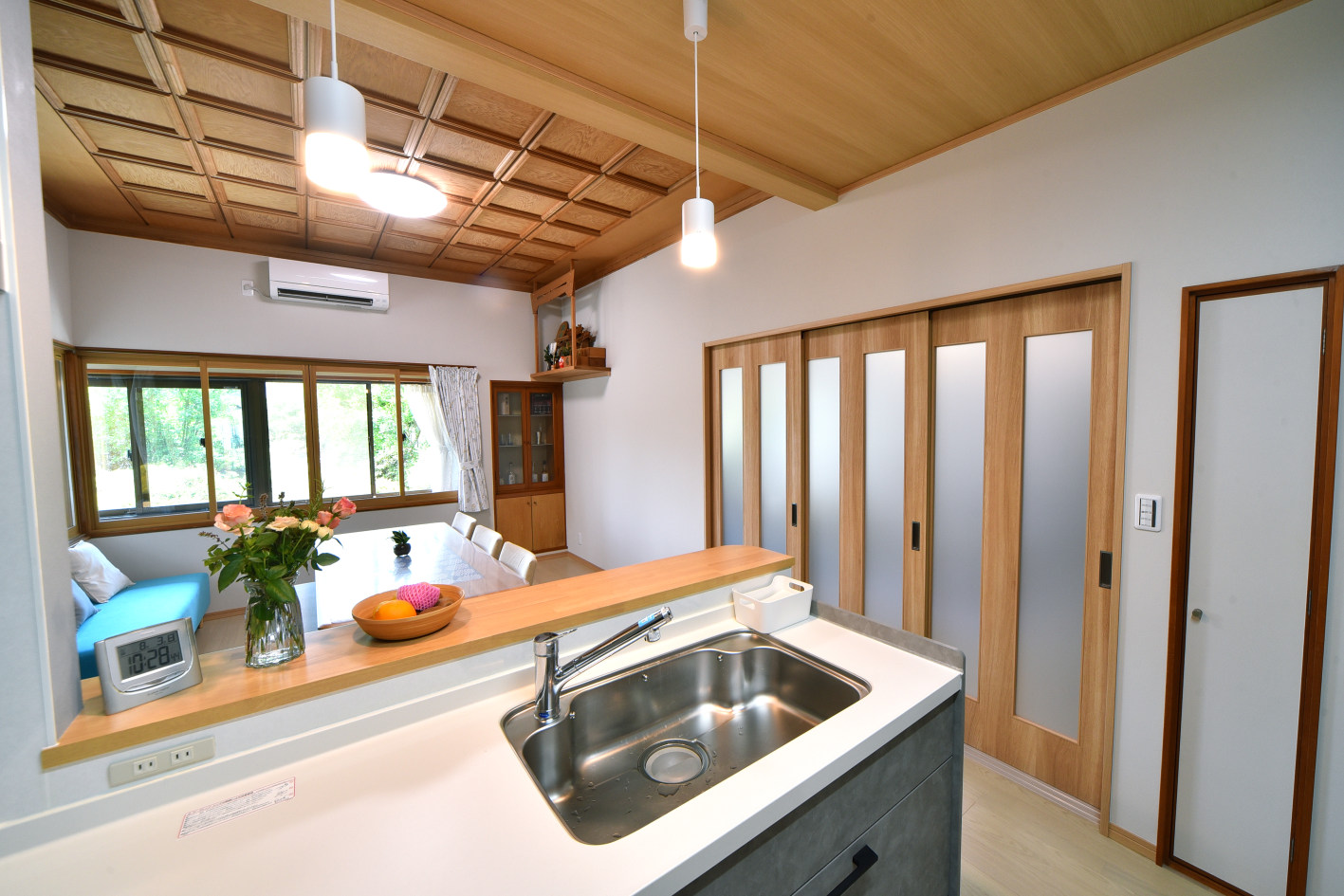 元和室の格天井に合わせてキッチンの天井は奥様の希望で木目に。ご主人様は始め難色を示したそうですが、これならと納得いただける仕上がりになりました。