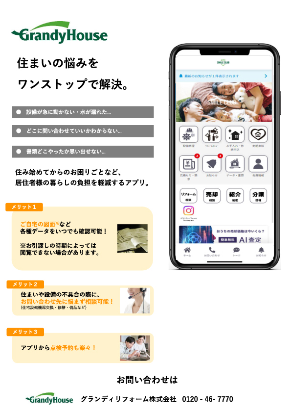 グランディハウスグループからのお知らせや点検予約、会員様限定のプレゼント企画などをお届けしています。